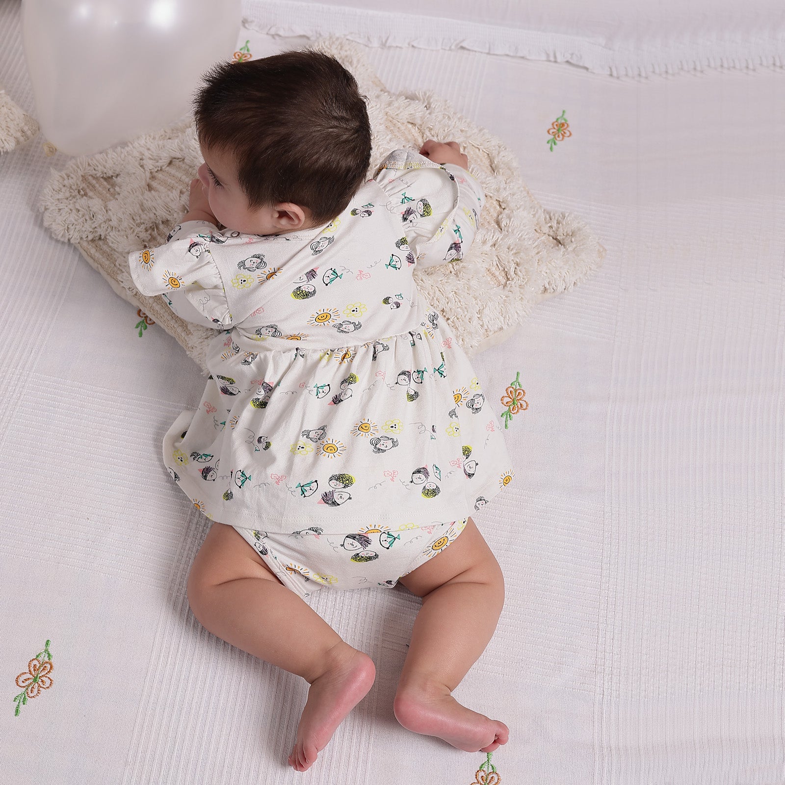 Brighten up your little one’s day with the Smiley Sunshine Onesie! Made from soft, cosy knit fabric in a cheerful yellow hue, this onesie is sprinkled with an adorable print. The round neckline and full sleeves keep your baby snug, while the playful ruffles add a touch of sweetness. And let’s not forget the flared skirt—it twirls with joy, making every wiggle extra cute. With an easy back opening for fuss-free changes, this onesie is perfect for giggles, cuddles, and all things sunny!